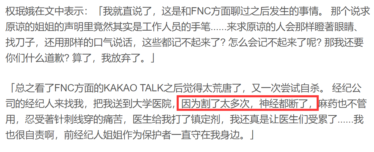 More images for 珉娥 自殘 » Sep 26, 2020 · 韓國女團「aoa」前成員權珉娥,先前在ig自爆遭成員霸凌長達10年,甚至po出自殘照片,引起軒然大波,現在珉娥已關閉ig,在家人陪伴下專心進行. 20 hours ago · 珉娥又被發現企圖自殺。(珉娥ig圖片) 珉娥留下親筆千字文圖片解釋過去的爭議。(珉娥ig圖片) 珉娥早前公開有新男友,可惜卻捲入第三者風波惹起爭議。(珉娥ig圖片) 現年27歲的前韓國女團aoa成員珉娥,去年自爆長期遭aoa前隊長智珉欺凌,她多次張貼. More images for 珉娥 自殘 » Aug 09, 2020 · 韓國女團aoa前成員權珉娥,先前在ig自爆遭成員霸凌長達10年的暗黑歷史,甚至數度作出自殘行為,6日權珉娥再度於ig放上自殘驚悚照,昨8日晚間更. Jun 26, 2021 · (圖/翻攝自珉娥ig) 而珉娥近期似乎狀況稍穩定,上周發文表示自己在釜山欲輕生,因多次自殘已感覺不出疼痛,回家5天後也沒記憶,等她回神. 1 hour ago · 前aoa珉娥疑家中自殺昏迷 昨晚ig發千字文鬧爆雪炫險成遺書 aoa前成員珉娥傳輕生 出血過多須動手術現時昏迷 最令人衝擊韓星︱前aoa珉娥自殘登第三 冠軍ig公開性事破壞形象 珉娥直播爆aoa有愛性生活成員 留言點名申智珉激嬲網民 前aoa珉娥認愛被爆疑做小三 發. 1 day ago · 南韓女團「aoa」前成員珉娥日前自爆遭到隊內申智珉等人霸凌,罹患憂鬱症多年,也多次貼出自殘照,讓歌迷相當擔心她的狀況;今(29)日傳出她. Aug 13, 2020 · 珉娥8日晚間因割腕被緊急送往醫院,由於珉娥已三度自殘,讓不少粉絲們屢屢受到驚嚇,不過皆希望她能積極接受治療。. Aug 06, 2020 · 」珉娥長期吃著抗憂鬱藥品,卻還是公開了一張手腕上滿是自殘的傷痕。以下整理了珉娥的ig內容以及智珉在道歉之後宣布退團的原因。 May 23, 2021 · 韓國女團「aoa」27歲前成員珉娥去年控訴遭隊友智珉霸凌11年,曾3度公開自殘照,上個月在ig直播透露國中時在空屋被大1、2歲的前輩砸啤酒瓶,甚至性侵,淒慘遭遇令人憐惜,她昨晚又突然再在ig放上滿手是血疑似自殘照,短短1小時就有5.6萬網友留言為她打氣,但她隨即刪圖,不知如今狀況如何,讓粉絲十分擔心。.